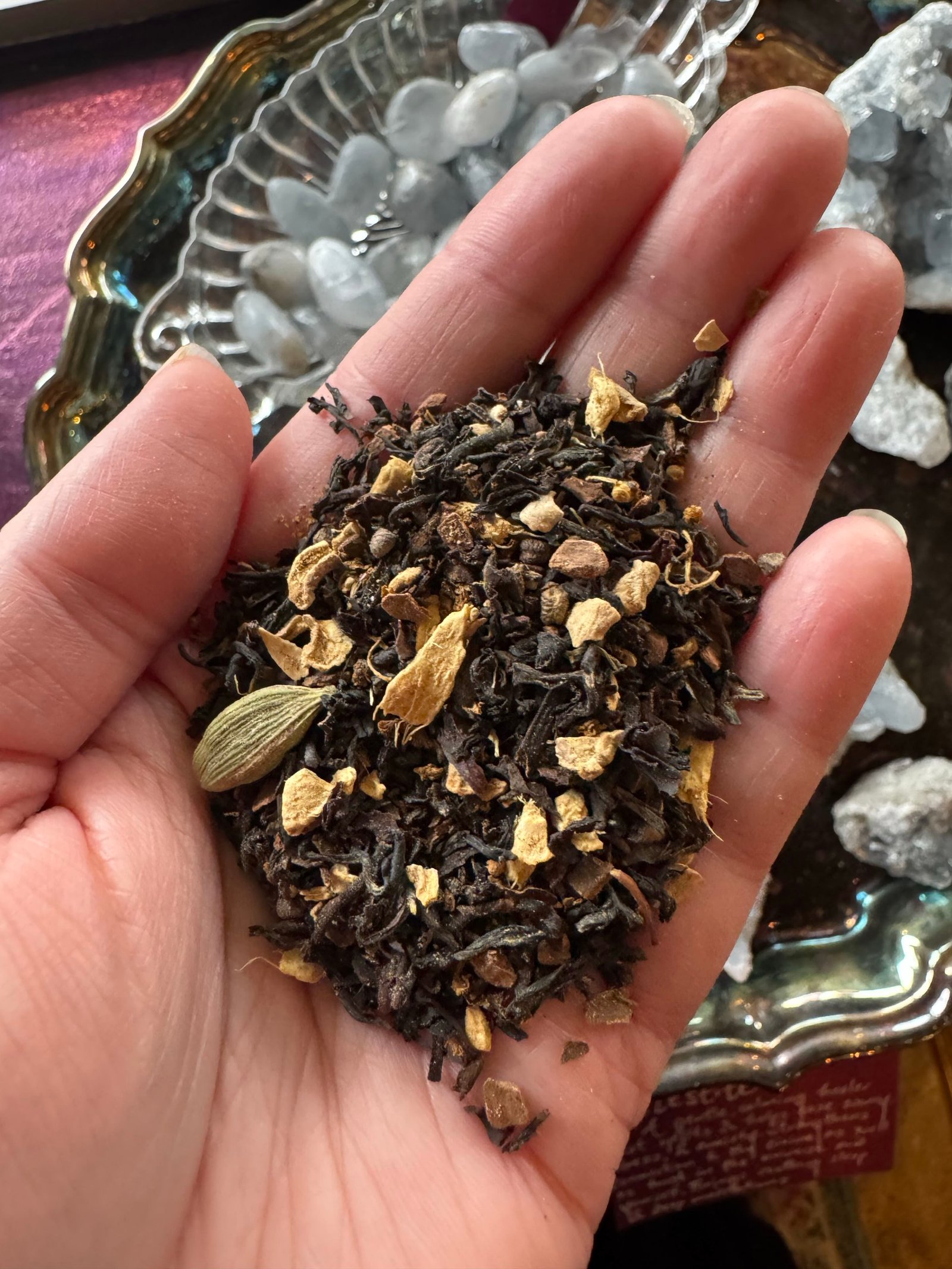 Ginger root, cinnamon chips, darjeeling tea, vanilla black tea, cardamom pods, cloves, nutmeg